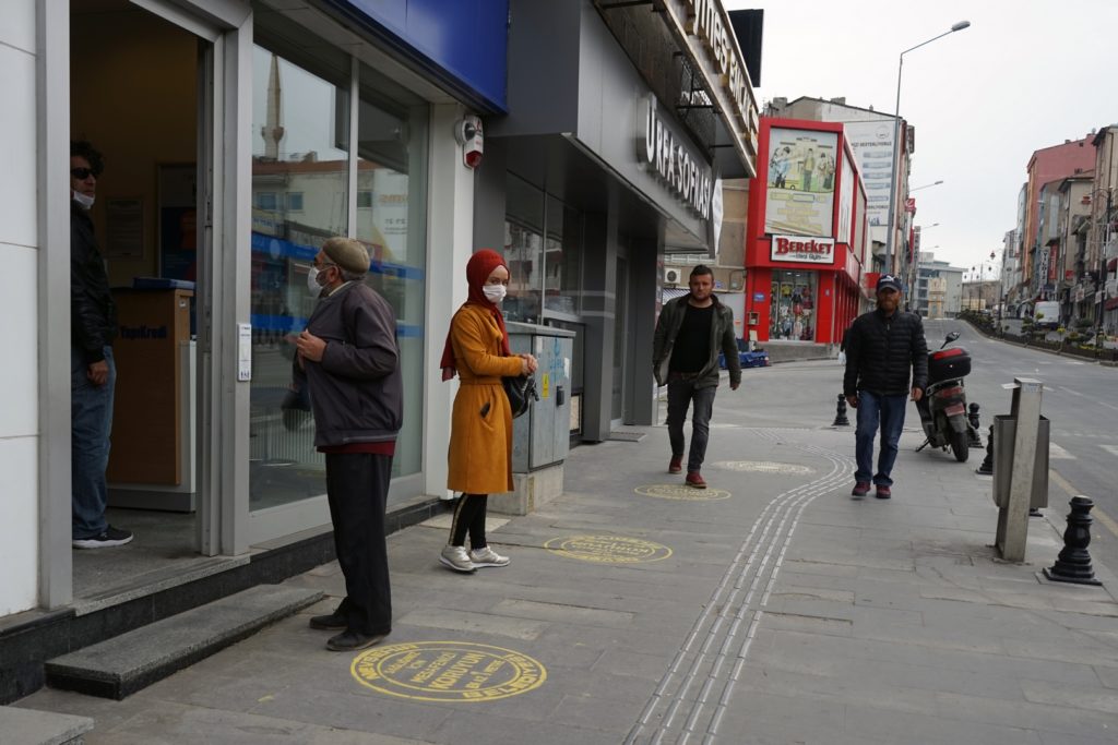 Bu kapsamda, bankaların girişleri ve ATM önlerindeki kaldırımlar sprey boya ile boyanarak, ‘Sağlığınız için mesafenizi koruyun. En az 1 metre’ yazıldı.