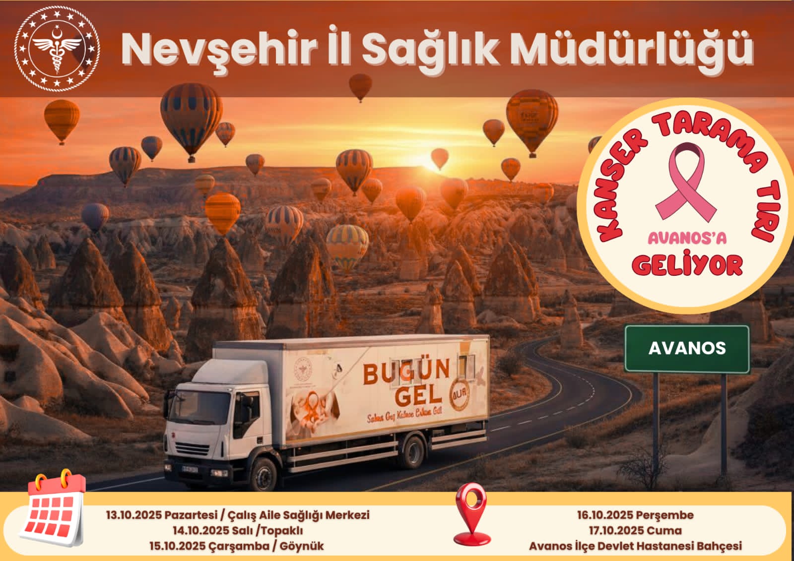 Nevşehir İl Sağlık Müdürlüğü, “Erken teşhis hayat kurtarır” sloganıyla yürütülen Kanser Tarama Tırı programı kapsamında Avanos’ta ücretsiz tarama hizmeti verecek.
