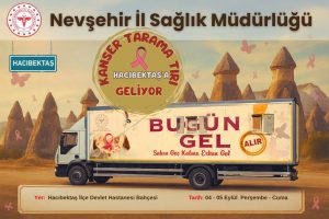 4-5 Eylül 2025 tarihlerinde Hacıbektaş İlçe Devlet Hastanesi bahçesinde hizmet verecek olan Kanser Tarama Tırı’nda, erken teşhis amacıyla ücretsiz taramalar yapılacak.