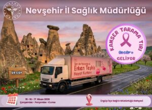 Nevşehir İl Sağlık Müdürlüğü tarafından yapılan açıklamaya göre, kanser tarama tırı 15-16-17 Nisan 2026 tarihlerinde Ürgüp İlçe Sağlık Müdürlüğü bahçesinde hizmet verecek.