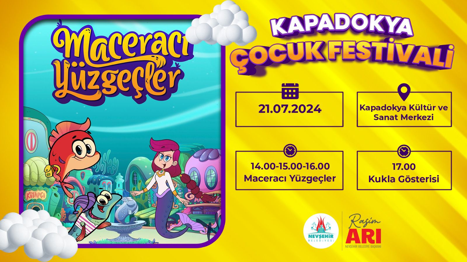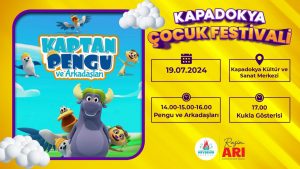 Bu yıl ilki gerçekleştirilecek ve daha sonra geleneksel hale gelecek olan Kapadokya Çocuk Festivalinin son günü ise, 21 Temmuz 2024 Pazar günü ‘Maceracı Yüzgeçler’ adlı Kukla Gösterisi olarak.