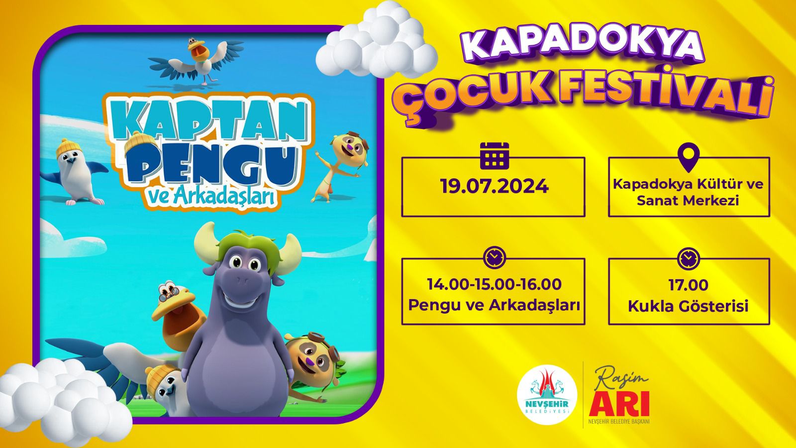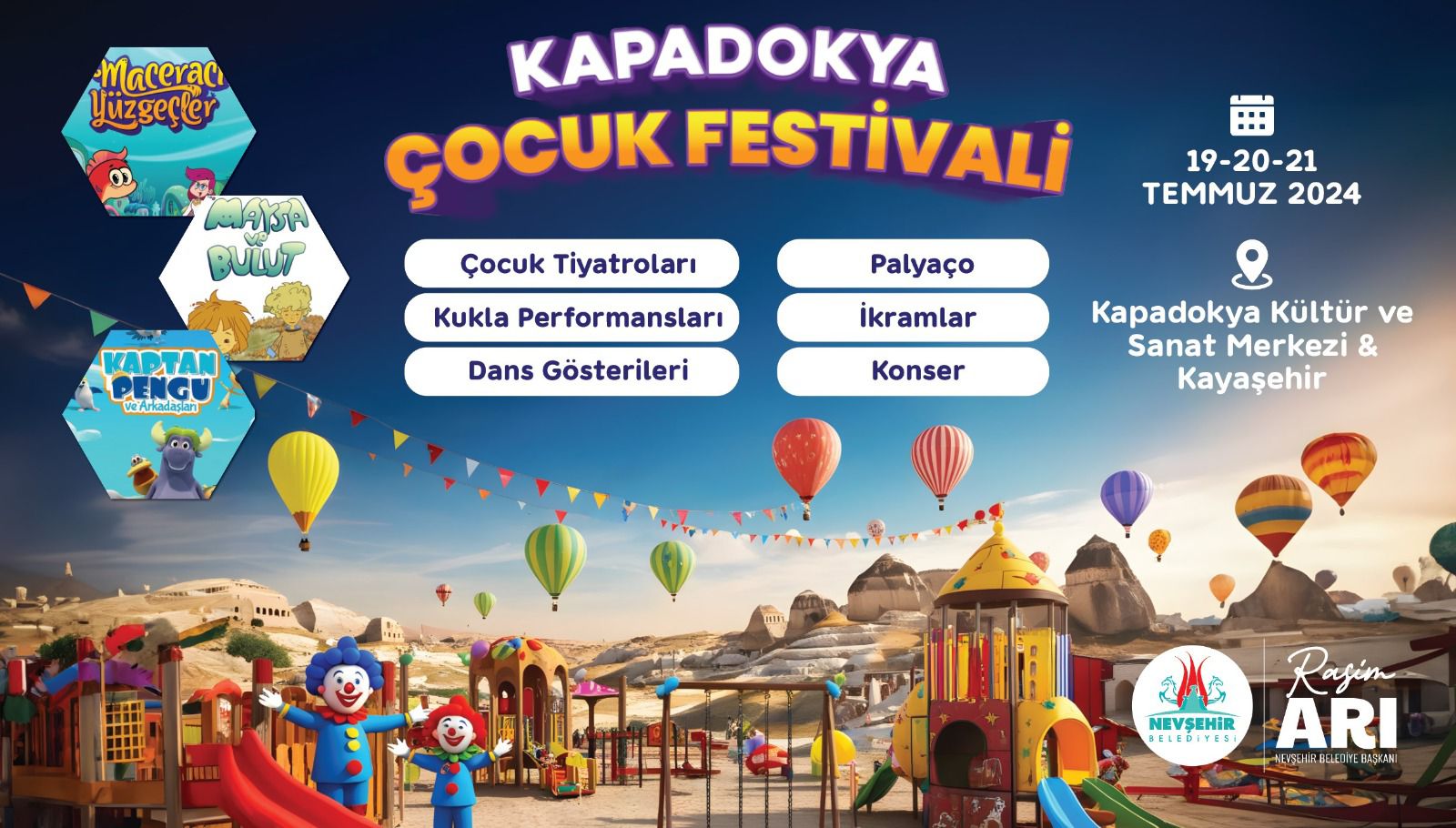 Nevşehir’in il oluşunun 70. Yıl dönümü kutlamaları çerçevesinde, Nevşehir Belediyesi tarafından gerçekleştirilecek olan Kapadokya Çocuk Festivali için hazırlıklar tamamlandı. Tatil döneminde çocukların doyasıya eğlenerek aileleri ile birlikte vakit geçirebilecekleri festival, 19 Temmuz 2024 Cuma günü Kapadokya Kültür ve Sanat Merkezi’nde ‘Pengu ve Arkadaşları’ adlı kukla gösterisi ile başlayacak.