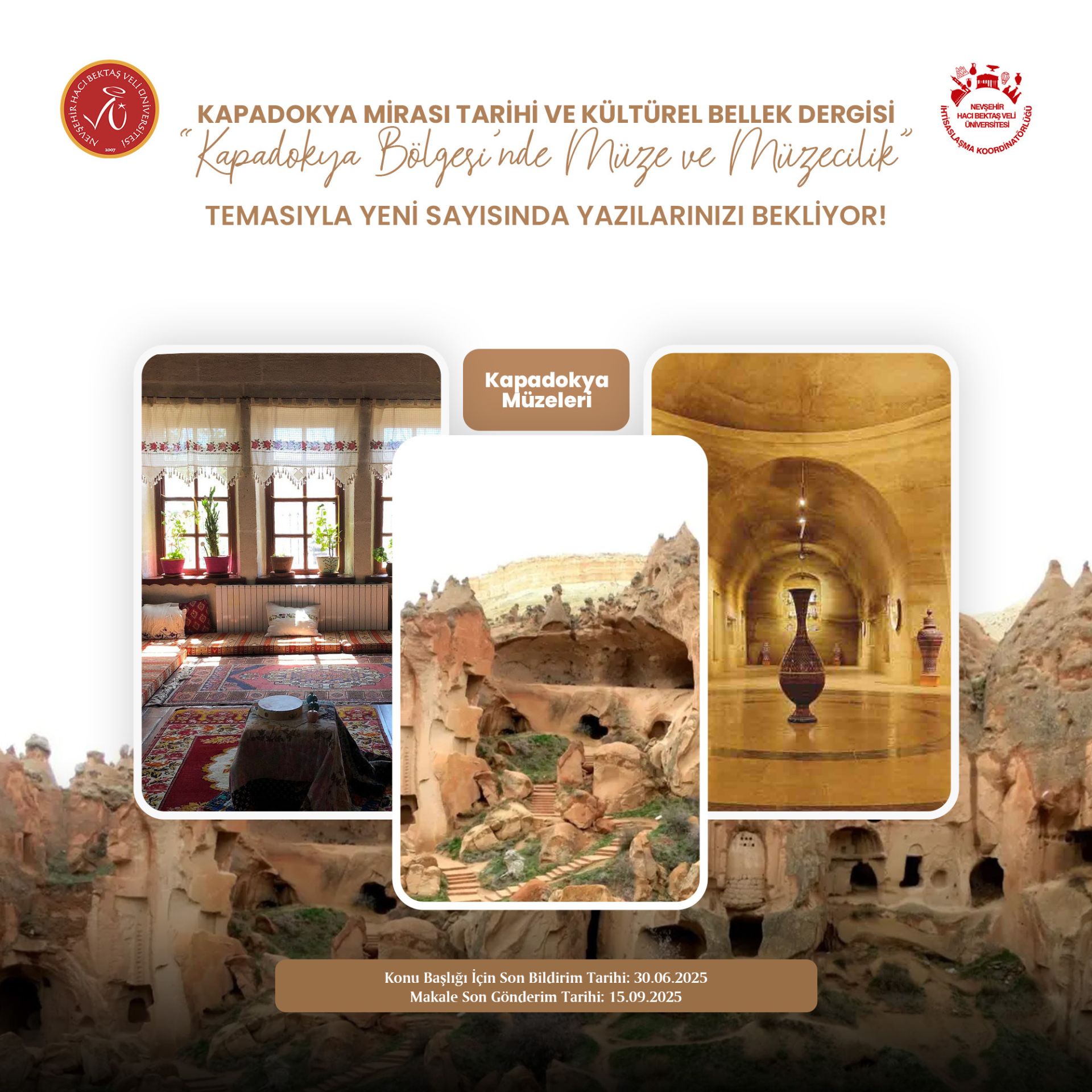 “Kapadokya Mirası: Tarihi ve Kültürel Bellek” dergisi 2025 güz sayısında “Kapadokya Bölgesi’nde Müze ve Müzecilik” temasını işlemeye hazırlanıyor. Bu sayı Kapadokya Bölgesi’nde yer alan müzeler, bu müzelerdeki kültürel miras çalışmaları, müzecilik yaklaşımları ve müze temelli turizm deneyimlerine odaklı olarak yayınlanacak.