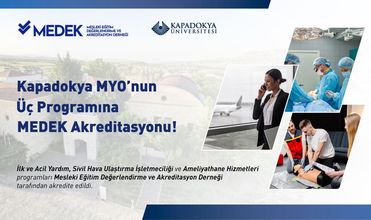 Kapadokya Meslek Yüksekokulu, eğitimde kalite ve standartlarını tescilleyen önemli bir başarıya imza attı. İlk ve Acil Yardım, Sivil Hava Ulaştırma İşletmeciliği ve Ameliyathane Hizmetleri programları, Mesleki Eğitim Değerlendirme ve Akreditasyon Derneği (MEDEK) tarafından akredite edildi.