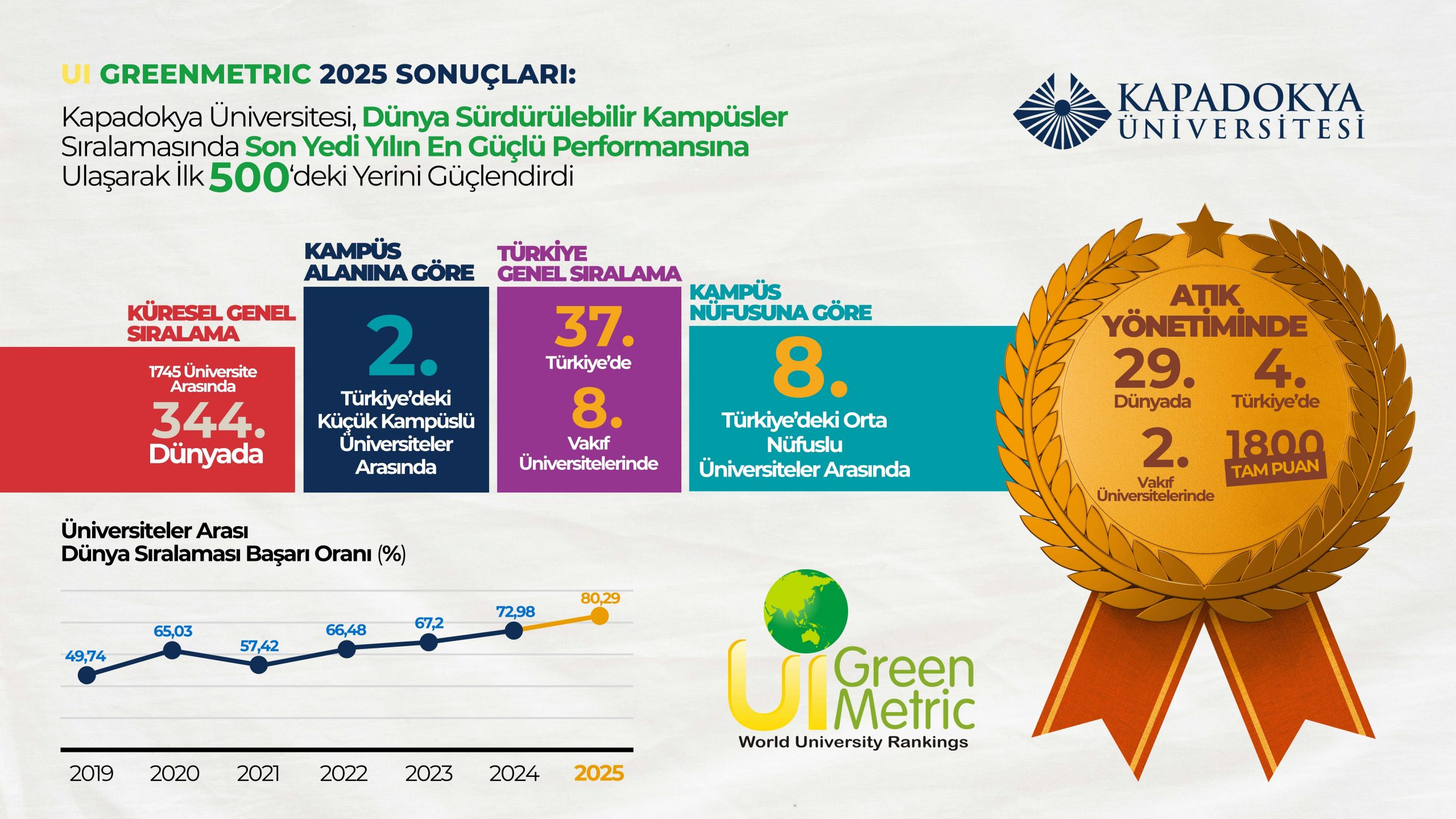 Kapadokya Üniversitesi (KÜN), 2025 yılında dünya genelinde 1745 üniversitenin değerlendirildiği UI GreenMetric Dünya Üniversiteler Sıralaması sonuçlarına göre, genel sıralamada geçen seneki konumu olan 399. sıradan 344. sıraya yükselerek sürdürülebilir üniversiteler arasında ilk 500’deki konumunu güçlendirdi.