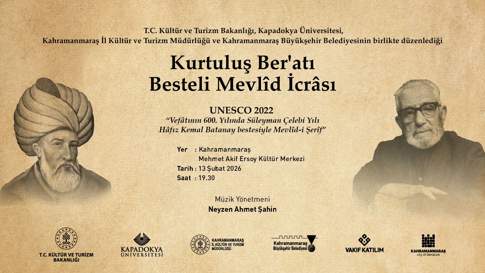 T.C. Kültür ve Turizm Bakanlığı desteğiyle, Kapadokya Üniversitesi(KÜN), Kahramanmaraş İl Kültür ve Turizm Müdürlüğü, Kahramanmaraş Büyükşehir Belediyesi iş birliğiyle ve Vakıf Katılım’ın katkılarıyla gerçekleştirilecek program, 13 Şubat 2026 Cuma günü saat 19.30’da Kahramanmaraş Mehmet Akif Ersoy Kültür Merkezi’nde izleyiciyle buluşacak.