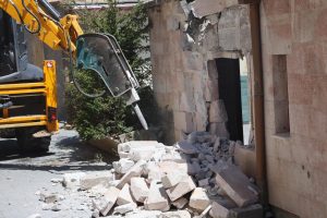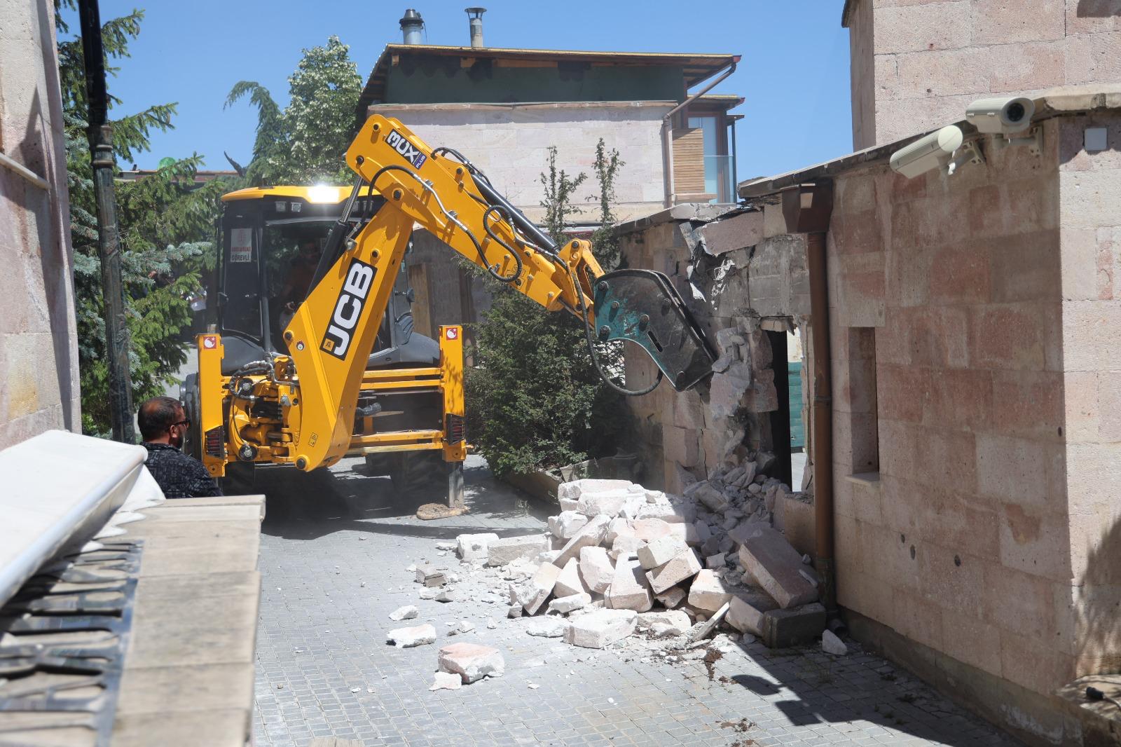 Alınan karar gereği merkeze bağlı Uçhisar beldesinde bulunan bir yapı yanındaki eklentileriyle birlikte yıkılmaya başladı.