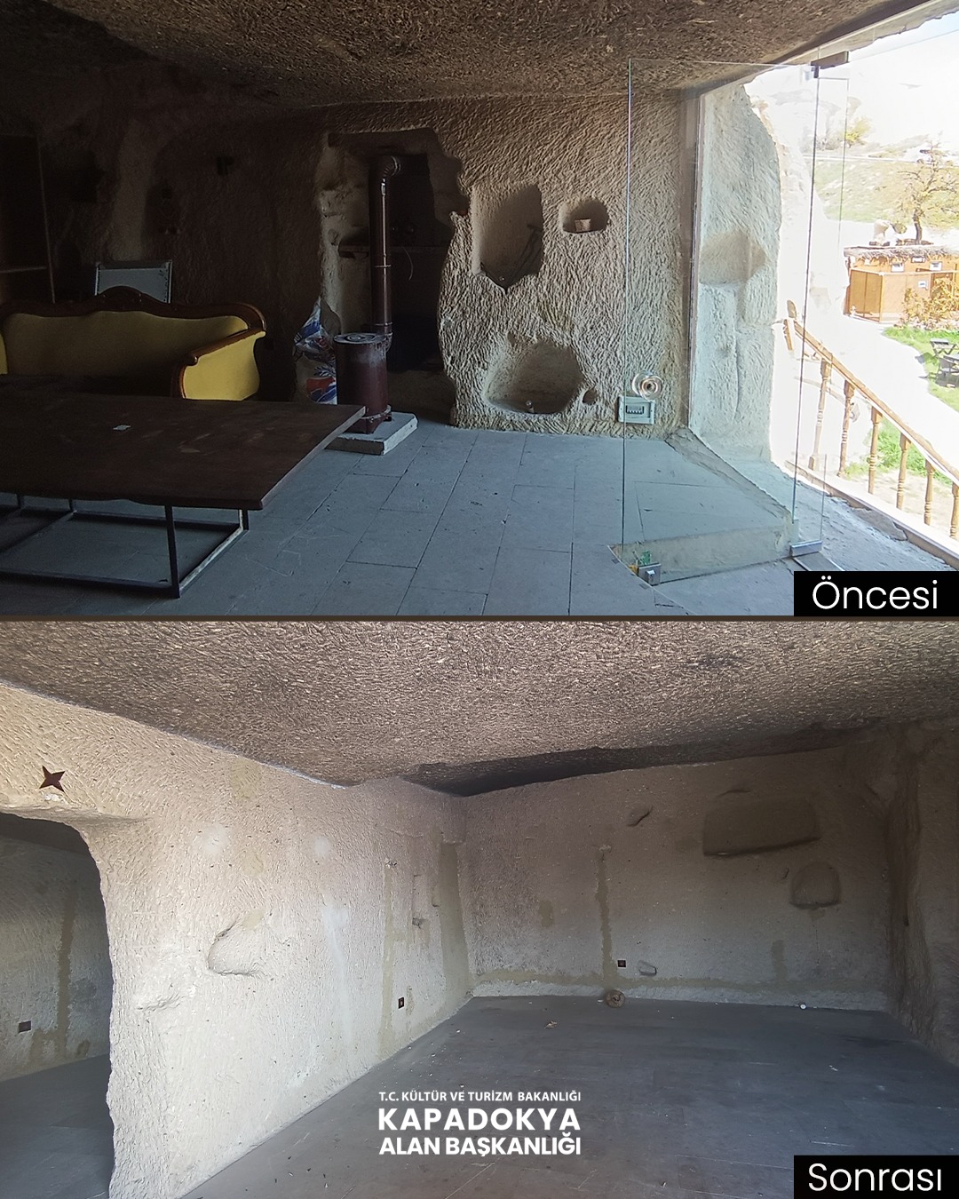 Nevşehir İli, Göreme Beldesinde, I. Derece Arkeolojik – I. Derece Doğal Sit Alanında yer alan ve restoran olarak kullanılan izinsiz yapının kaldırılmasıyla birlikte, kaya oluşumlar ve tarihi peyzaj ile bütünleşen peribacalarının özgün silüeti yeniden ortaya çıktı.