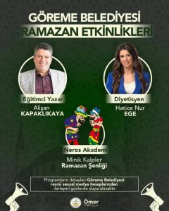 Ramazan Etkinlikleri kapsamında birçok program yer alacak. Detaylı açıklamalar, Göreme Belediyesi resmi sosyal medya hesaplarından ilerleyen günlerde paylaşılacak.