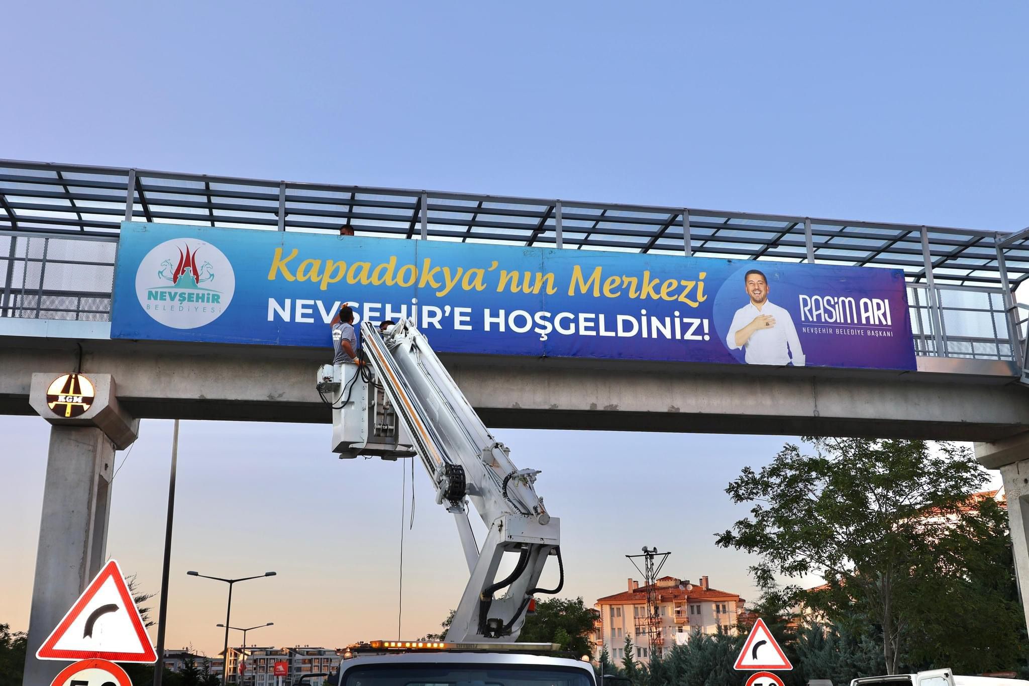 Nevşehir Belediyesi tarafından bir süre önce bir üst geçide asılan ve Karayolları Bölge Müdürlüğü tarafından kaldırılan ‘Kapadokya’nın Merkezi Nevşehir’e Hoş Geldiniz’ yazısı tekrar aynı yerine asıldı.