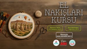 El Nakışları Kursu; Başvuruların 23 Temmuz 2025 Çarşamba günü başladığı kurs 04 Ağustos 2025 tarihinde başlayıp 14 Ocak 2026 tarihinde tamamlanacak. Kurs Pazartesi, Salı, Çarşamba, Perşembe ve Cuma günleri (hafta içi her gün) 13.00 – 16.00 saatleri arasında yapılacak.