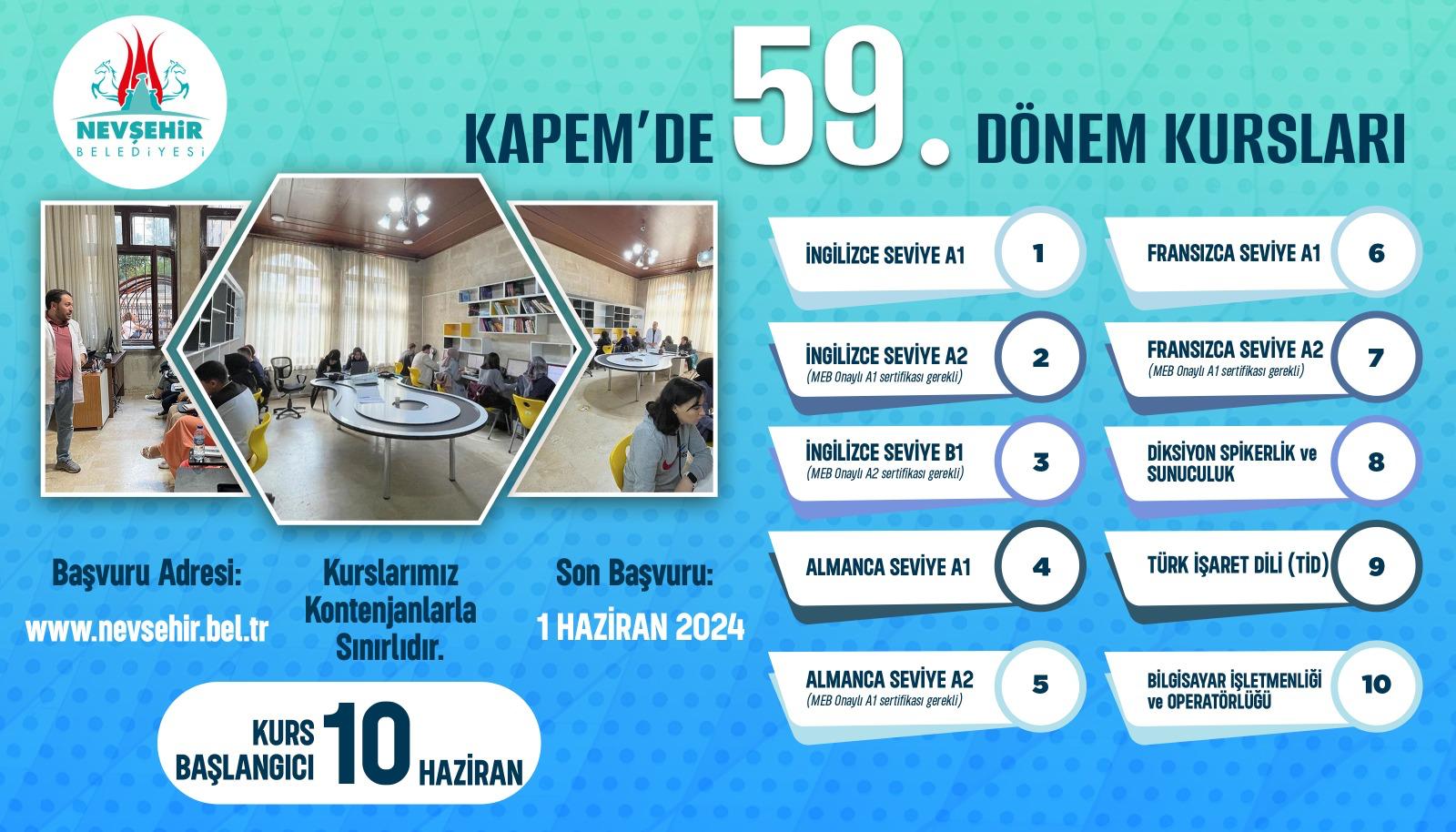 Nevşehir Belediyesi Gençlik ve Spor Hizmetleri Müdürlüğü bünyesinde faaliyetlerini sürdüren Kapadokya Eğitim Merkezi (KAPEM)’de 59. Dönem kursları Haziran ayında başlayacak.