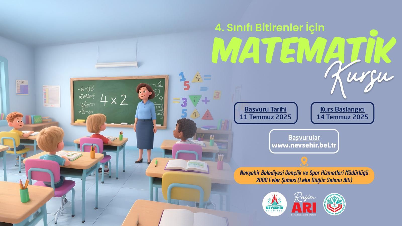 4. Sınıf Mezunları için Matematik Kursu; 4. Sınıf Matematik kursu 14 Temmuz 2025 tarihinde başlayacak ve 30 Temmuz 2025 tarihinde tamamlanacak. Kurs Pazartesi, Salı ve Çarşamba günleri 10.00 – 12.00 saatleri arasında haftada üç gün yapılacak.