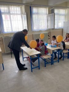 Karapınar Beldesindeki, Karapınar İlkokulu’nu ziyaret eden Karapınar Belediye Başkanı Yasin Güneş, beraberinde getirdiği rengarenk balonları ve çikolataları öğrencilere dağıttı.