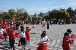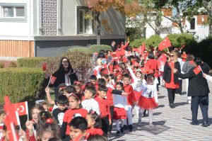 Okul bandosu eşliğinde düzenlenen yürüyüşte, öğrenciler Mustafa Kemal Atatürk’ün bulunduğu kıyafetler giyerek ellerindeki Türk bayrakları salladı.