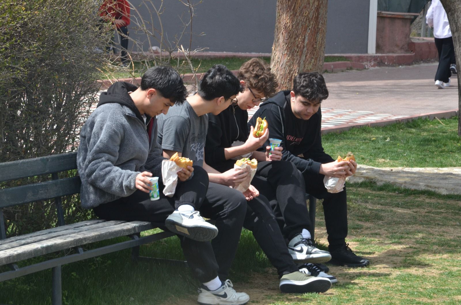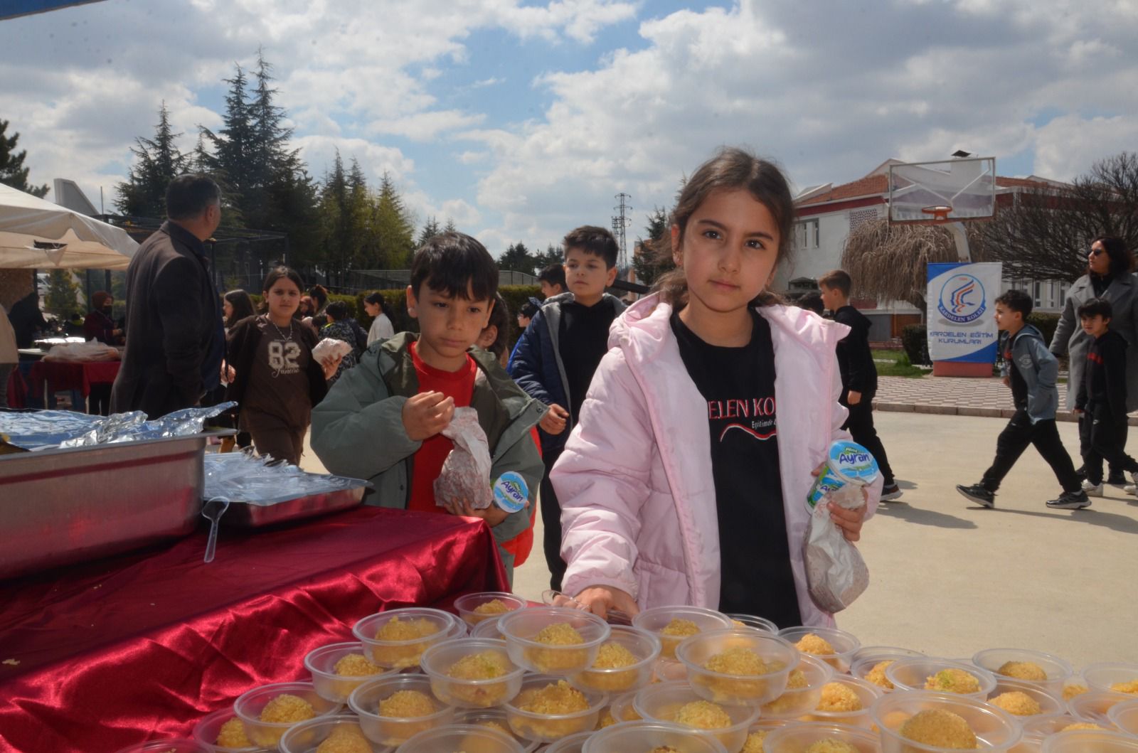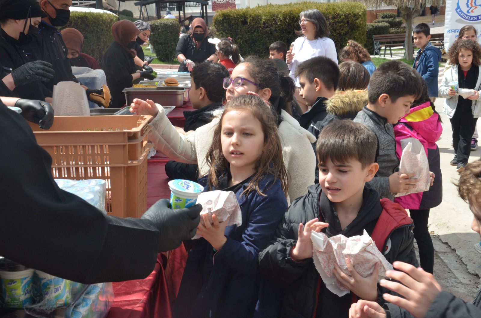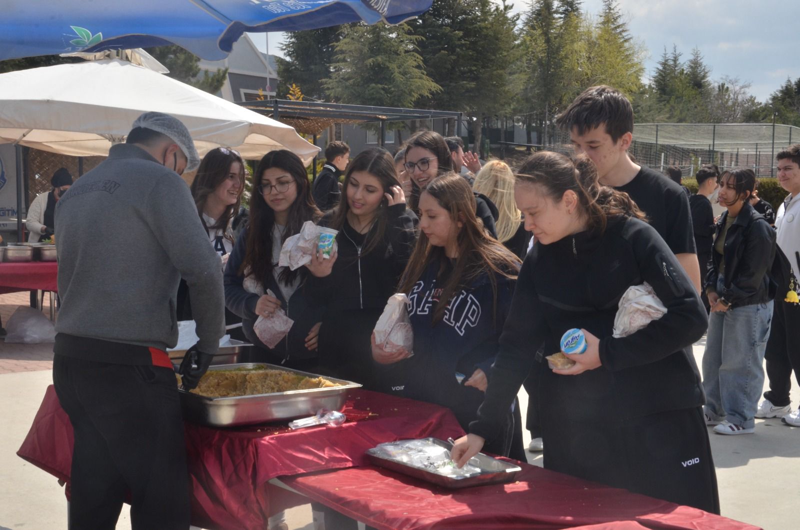 Havaların ısınmasıyla birlikte okul bahçesine kurulan dev mangallarda hazırlanan kasap köfteleri, patates kızartması, salata, içecek ve tatlı eşliğinde öğrencilere sunuldu.
