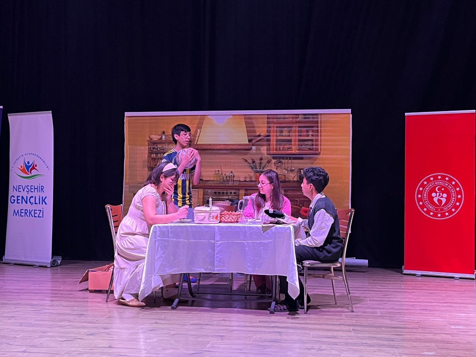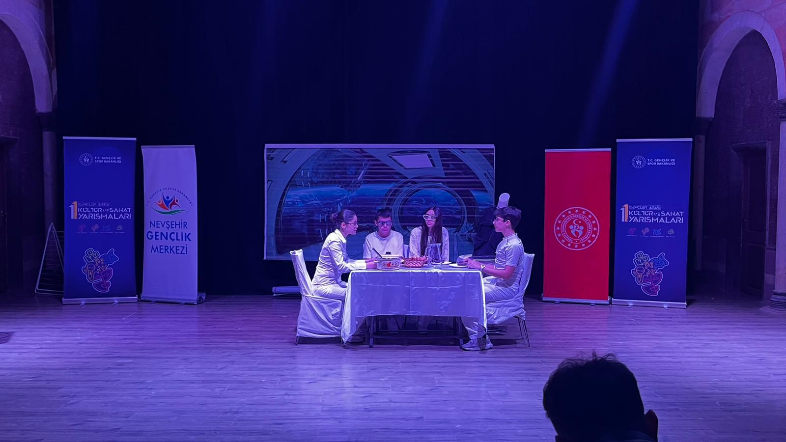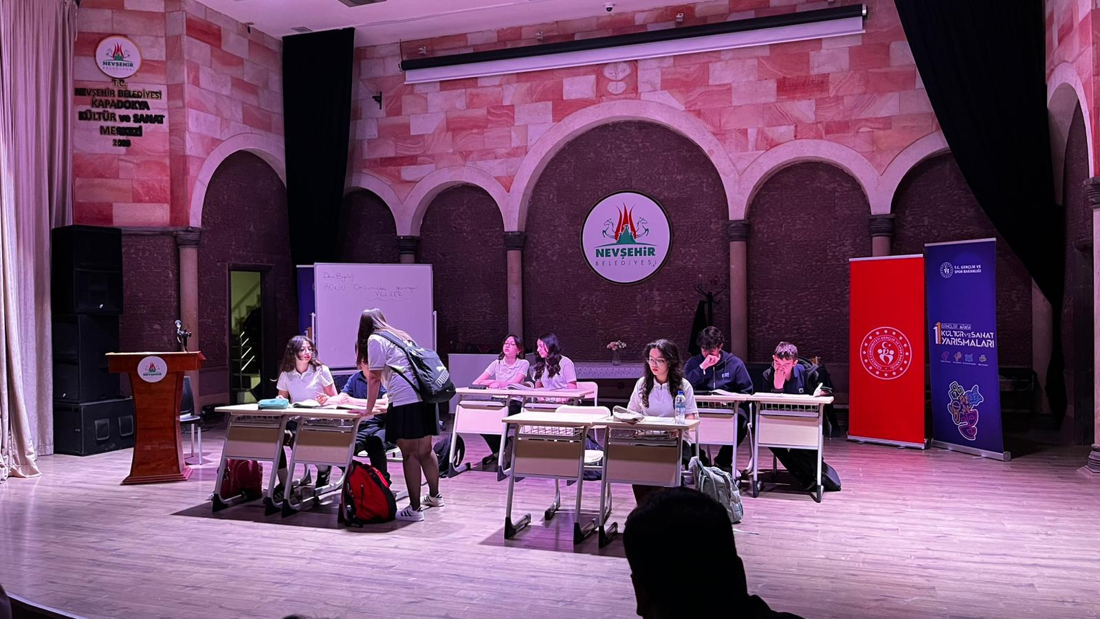 Kapadokya Kültür ve Sanat Merkezinde gerçekleştirilen ve Okulumuzdan 4 ekibin tiyatrolarını sahnelediği yarışmada sırasıyla “Omzumuzda Görünmeyen Veliler”, “Geçmiş ve Geleceğimiz”, “Sıradan Günler” ve “Şevketin İlk Günü” oyunları seyirciden büyük alkış aldı.