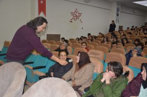 Sorulan sorularla öğrencilerin de keyifli vakit geçirmeleri sağlandı. Bir öğrenci verdiği doğru cevapla kitap kazandı.