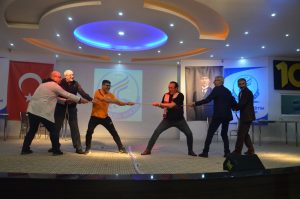 Enstrümanların da tanıtıldığı etkinliğin sonunda öğretmenlerden oluşan iki takım, ellerini bırakmadan çemberin içinde geçme oyunu oynadı.