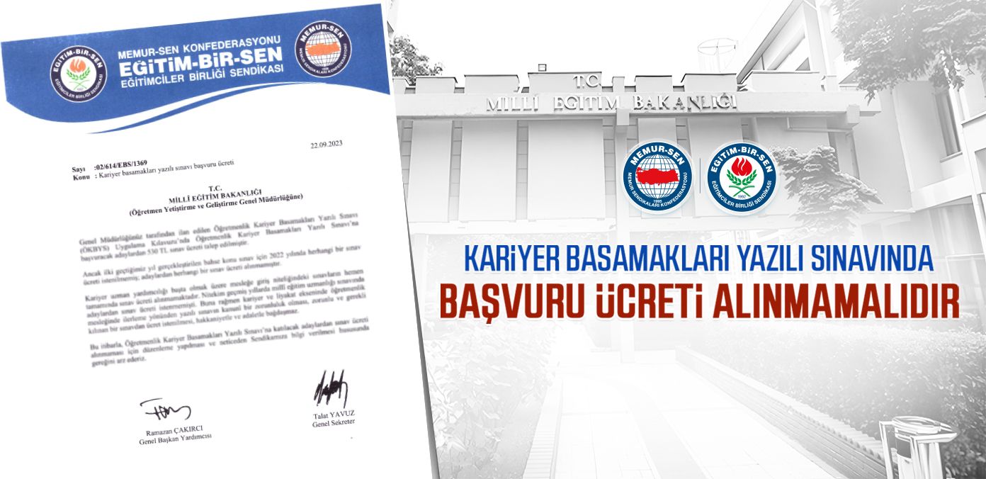 Açıklamada; “Eğitim-Bir-Sen olarak Millî Eğitim Bakanlığı’na başvuruda bulunarak, Öğretmenlik Kariyer Basamakları Yazılı Sınavı’na katılacak adaylardan sınav ücreti alınmamasını talep ettik.