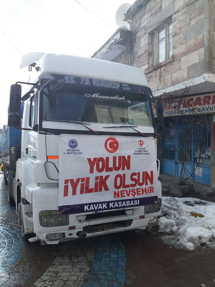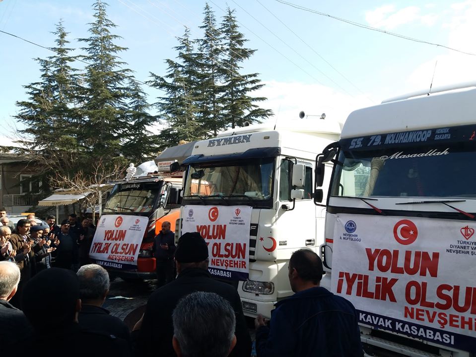 Nevşehir İl Müftülüğü öncülüğünde Diyanet İşleri Başkanlığı tarafından yürütülen “Yolunuz İyilik Olsun Projesi” kapsamında Kavak halkından toplanan 2 tır patates,1 tır un toplam 3 tır insani yardım malzemesi, İdlib’deki savaş mağdurlarına gönderilmek üzere yola çıktı.