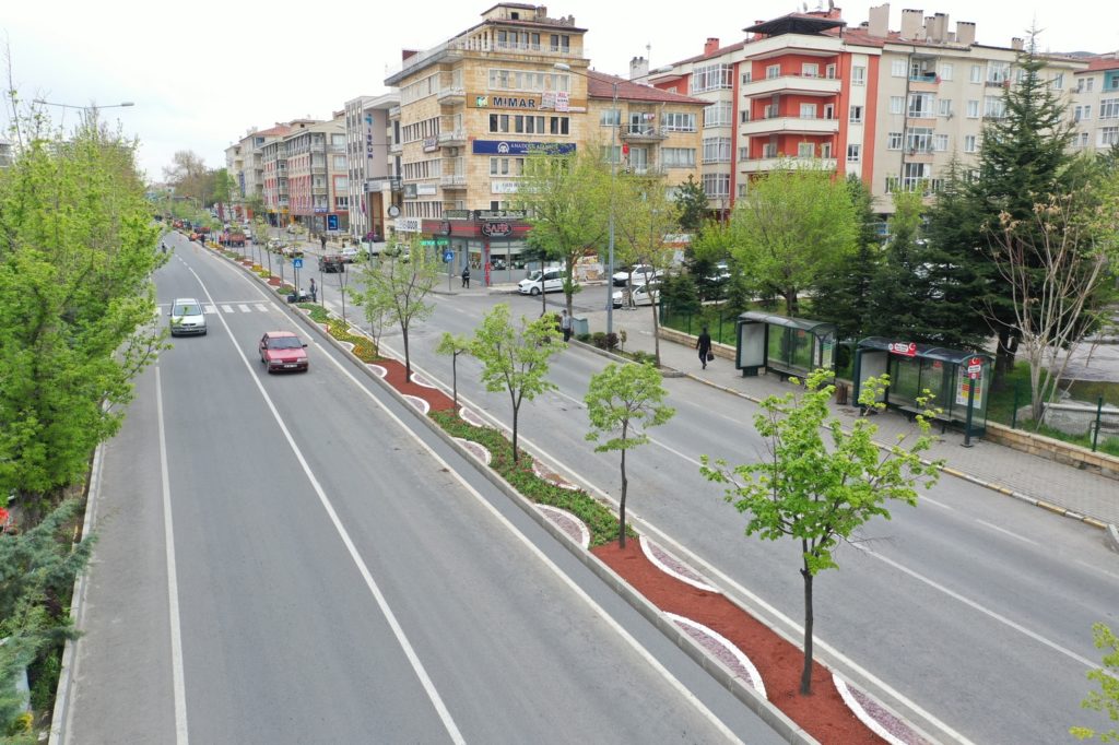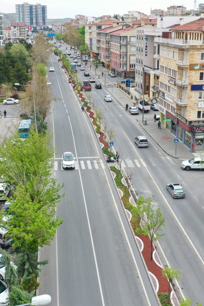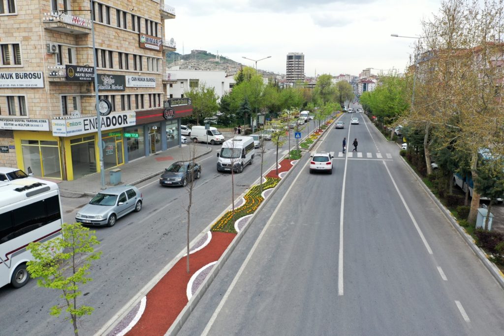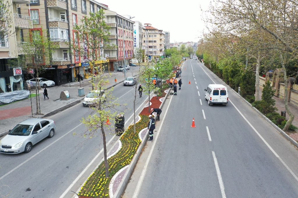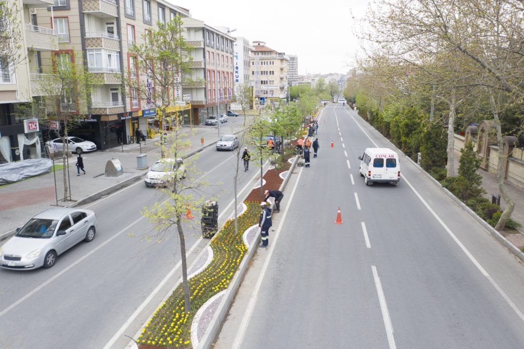 Yeni ağaçlandırma çalışmalarının da yapıldığı caddedeki refüjlere ayrıca otomatik damlama sulama sistemleri de döşendi.