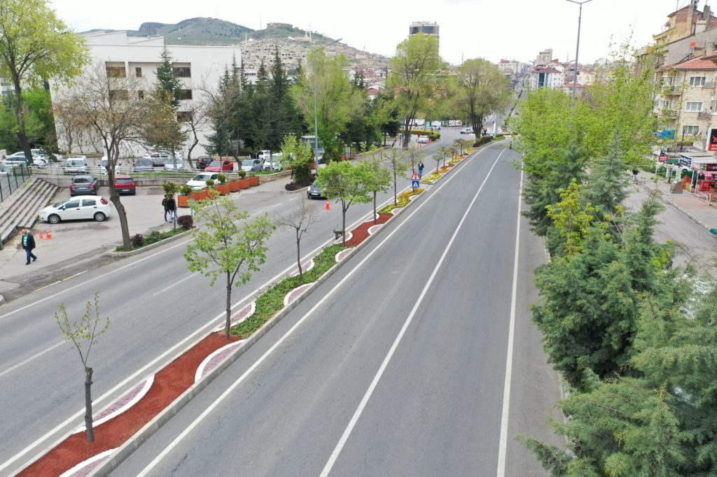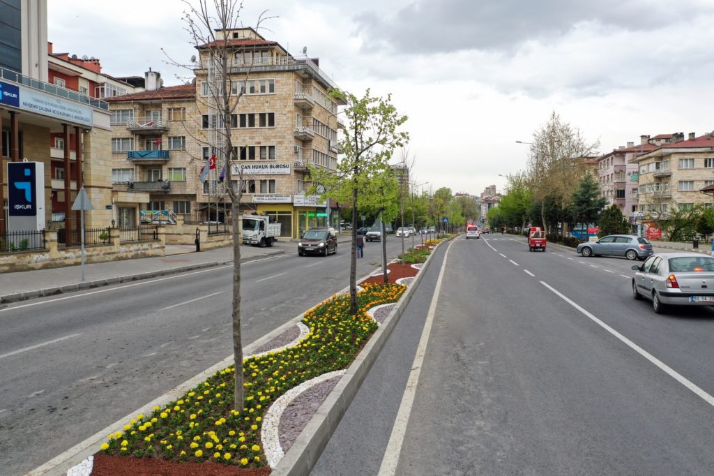 Rengarenk çiçekler orta refüj ve kavşaklarda estetik peyzaj projeleriyle Nevşehirlilere baharı müjdelerken, caddeyi muhteşem bir güzelliğe kavuşturdu.