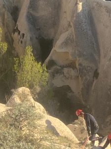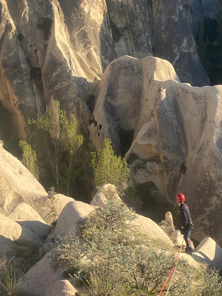 Kapadokya bölgesinde vadi yürüyüşü yapan bir grup yabancı turist, Ortahisar-Göreme arasında bir vadide kayalıklardan düşen bir köpeğin kayalıklarda sıkışarak mahsur kaldığını fark etti. Turistlerin durumu 112 Çağrı Merkezi’ni arayarak bildirmeleri üzerine harekete geçen Nevşehir Belediyesi İtfaiye Müdürlüğü ekipleri, köpeği kurtarmak için harekete geçti. İtfaiye ekipleri, yaklaşık 6 saatlik bir çalışma sonucu köpeği sıkıştığı kayalıklardan kurtarmayı başardı.