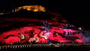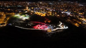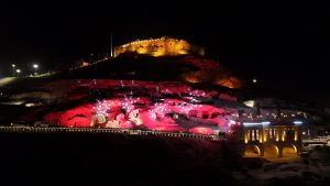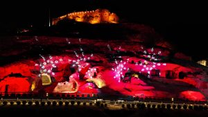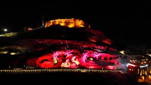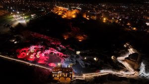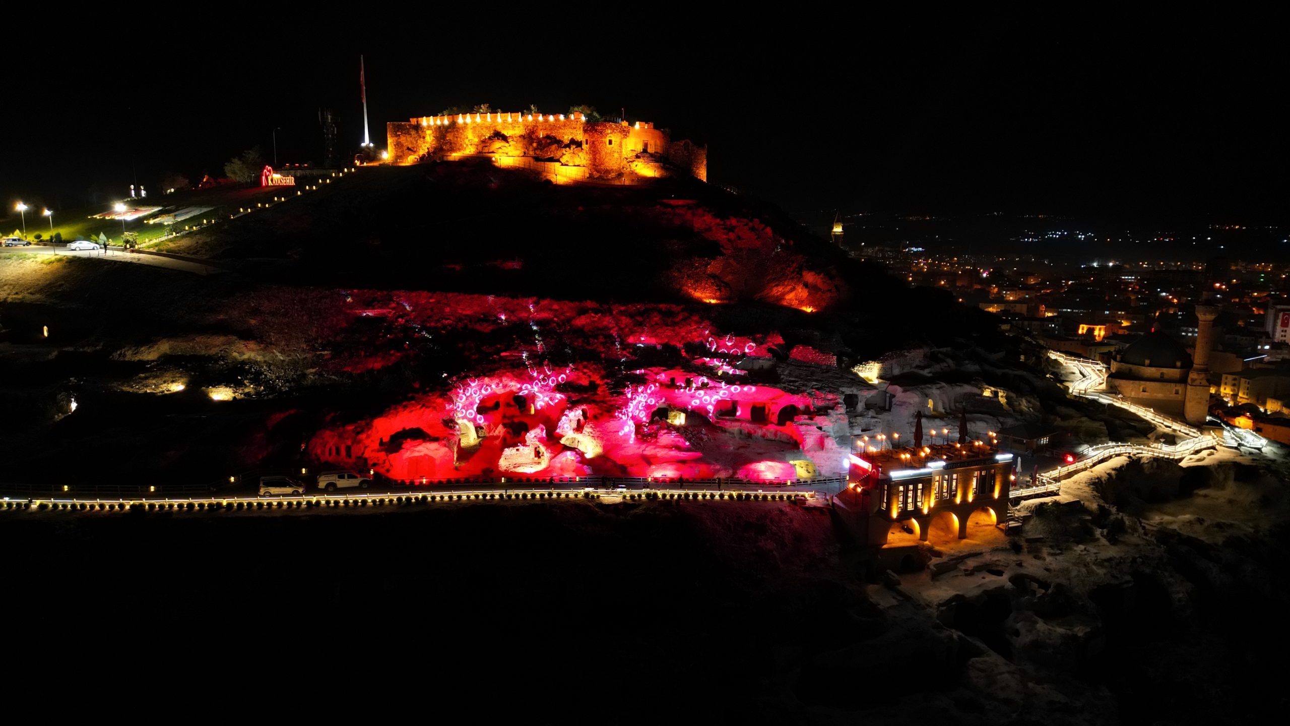 Dünyanın en büyük kaya oyma yamaç yerleşim merkezi olan tarihi Kayaşehir’de, kırmızı beyaz renklerle yapılan ışık gösterisi görsel bir şölen oluşturdu.