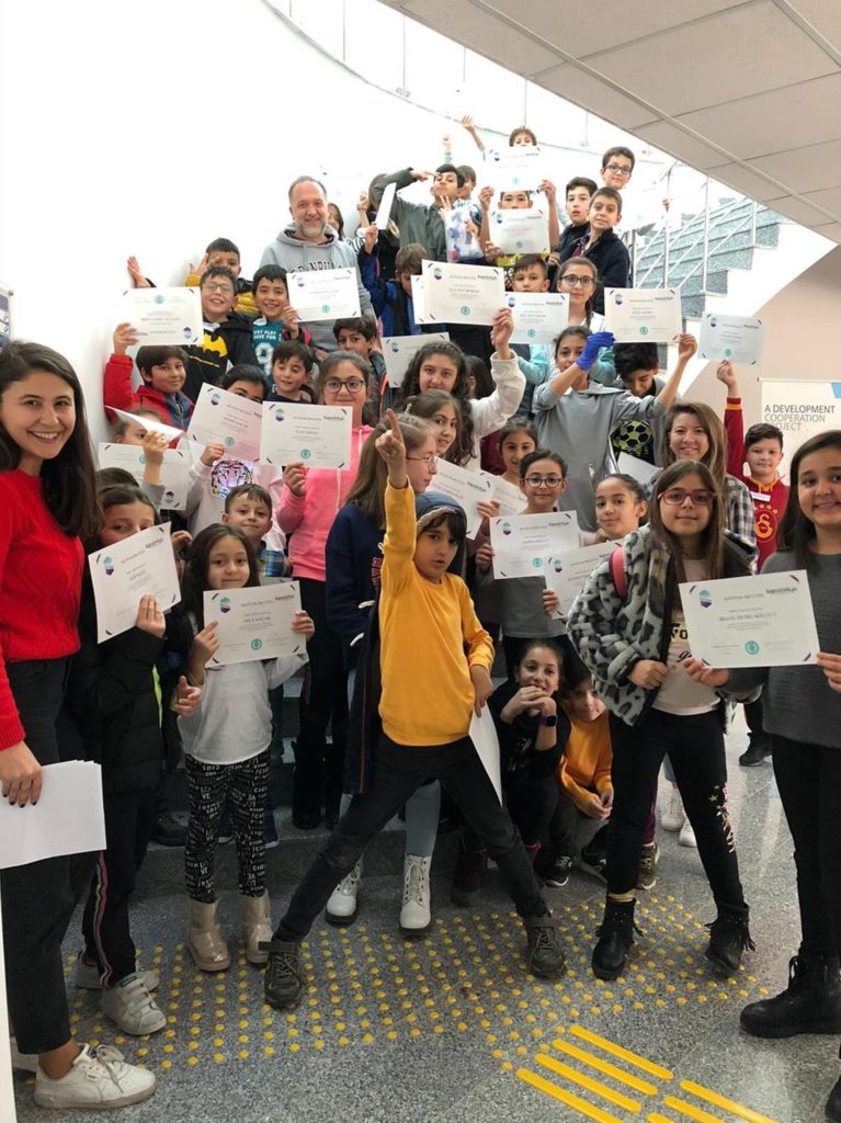 DNA ile ilgili soruların cevaplarını hem teorik hem de pratik olarak alan çocuklar, deney setlerini ve katılım sertifikalarını alarak günü mutlulukla bitirdiler.