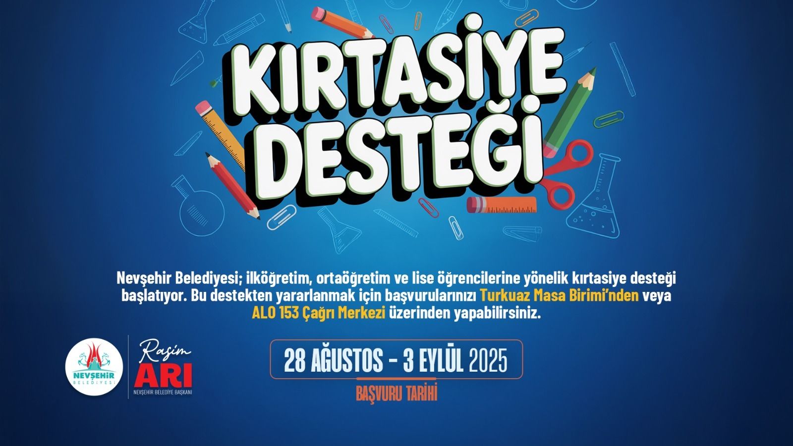 Belediye Başkanı Rasim Arı öncülüğünde, eğitimin her alanında öğrencilere ve velilere destek olan Nevşehir Belediyesi, eğitimde fırsat eşitliği sağlamak ve öğrencilerin eğitim hayatlarını daha verimli sürdürebilmelerine yardımcı olmak amacıyla ihtiyaç sahibi ilkokul, ortaokul ve lise öğrencilerine kırtasiye yardımında bulunacağını duyurdu.