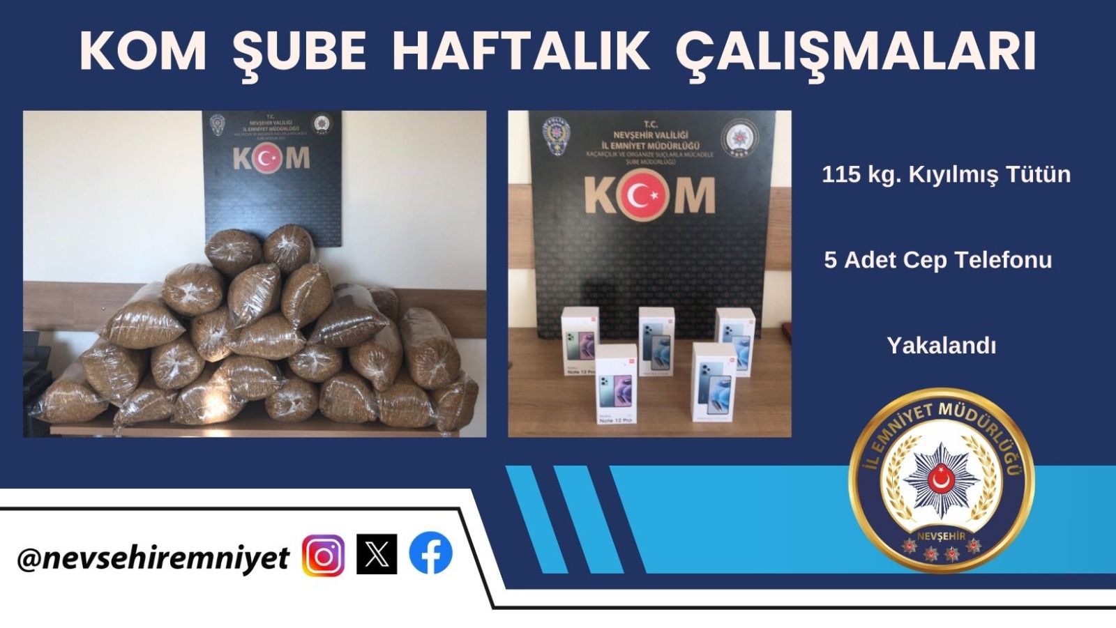 KOM Şube Müdürlüğü ekiplerince son bir hafta içerisinde yapılan çalışmalarda; 2 farklı “Kaçakçılıkla Mücadele Kanununa Muhalefet” olayında yapılan ikamet ve araç aramasında 5 adet kaçak cep telefonu, 115 kg. kıyılmış tütün ele geçirilirken 3 şahsa işlem yapıldı. 2 Resmi Belgede Sahtecilik olayında ise 3 şahıs hakkında gerekli işlemler yapıldı.