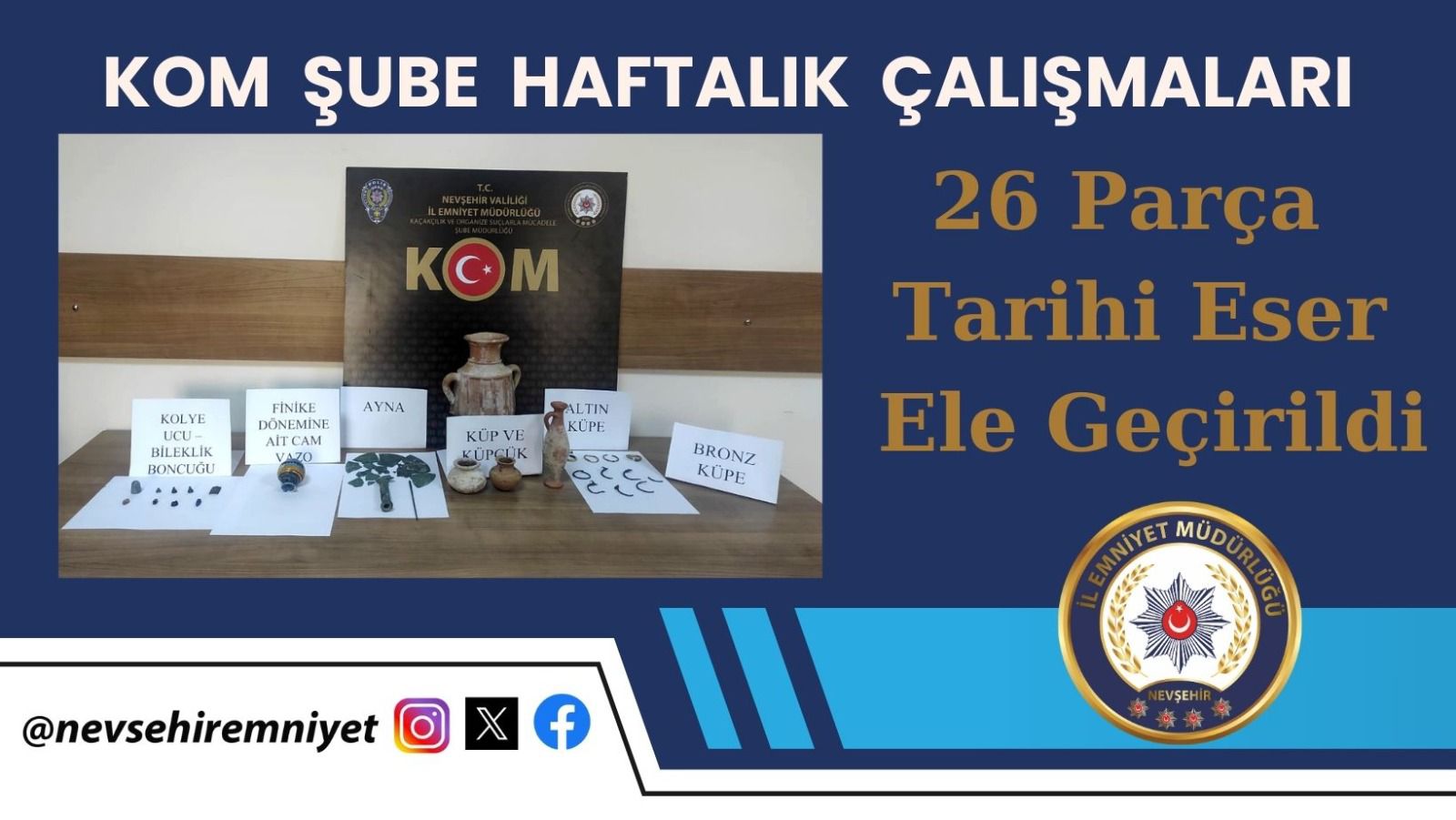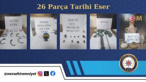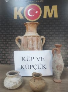 KOM Şube Müdürlüğü ekiplerince son bir hafta içerisinde şüpheli 1 şahsın ikametinde yapılan aramada küp, küpçük, küpe, küpe ucu, ayna bulunan toplamda 26 parça tarihi eser ele geçirilmiş, 1 şahıs hakkında gerekli adli işlemler yapılmıştır.