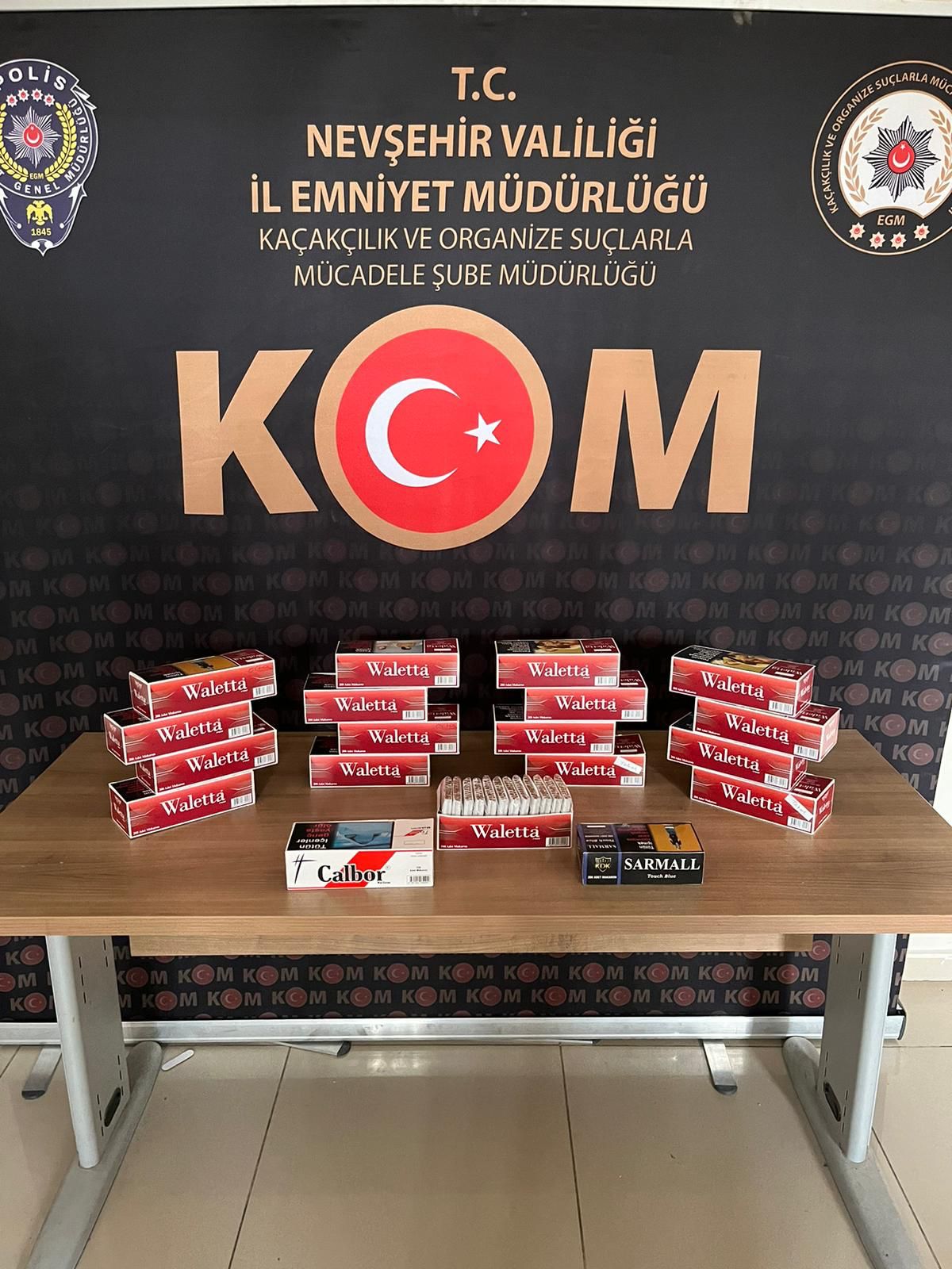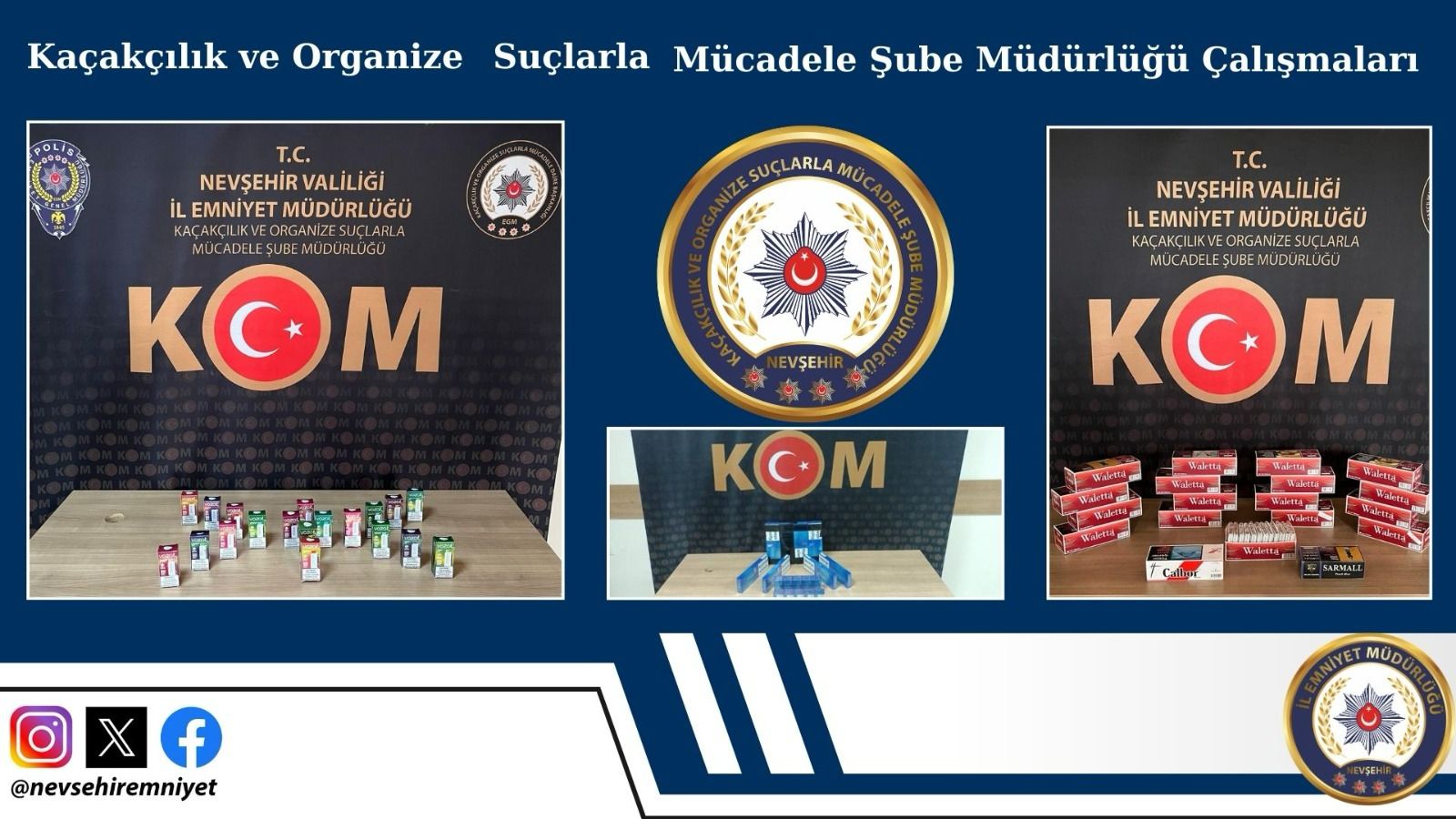 Nevşehir Emniyet Müdürlüğü KOM Şube Müdürlüğü ekiplerince son bir hafta içerisinde yapılan 3 çalışmada çok sayıda yasadışı ürün ele geçirildi. 3.800 adet doldurulmuş makaron, 100 paket kaçak sigara, 19 adet elektronik sigara ele geçirilirken 3 şahıs hakkında gerekli işlemler yapıldı.