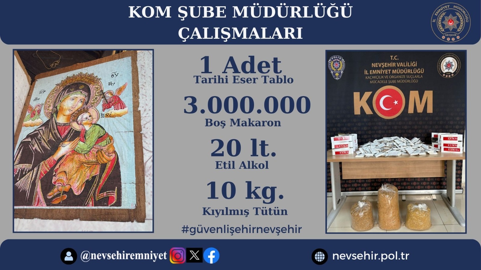 KOM Şube Müdürlüğü ekiplerince son bir hafta içerisinde ilimizde kaçakçılığın önlenmesi kapsamında yapılan çalışmalarda 1 adet tarihi eser tablo, 3.000.000 adet boş makaron, 20 lt. etil alkol, 10 kg kıyılmış tütün yakalandı.