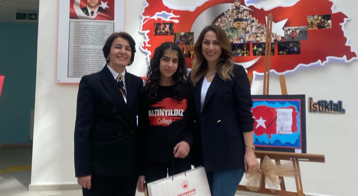 Altınyıldız İlköğretim Kurumu öğrencilerinden Yağmur KAYMAZ Nevşehir Valiliği İl Milli Eğitim Müdürlüğü tarafından Cumhuriyetin 100. Yılında Mehmet Akif Ersoy İstiklal Marşı ve Vatan Konulu Kompozisyon Yarışması’nda Nevşehir ikinciliği ile güzel başarı elde etti. Öğrenci Yağmur KAYMAZ ikincilik ödülünü Nevşehir Recep Tayyip Erdoğan Anadolu İmam Hatip Lisesinde düzenlenen 12 Mart İstiklal Marşının Kabulü ve Mehmet Akif Ersoy’u anma programındaki ödül töreninde aldı.