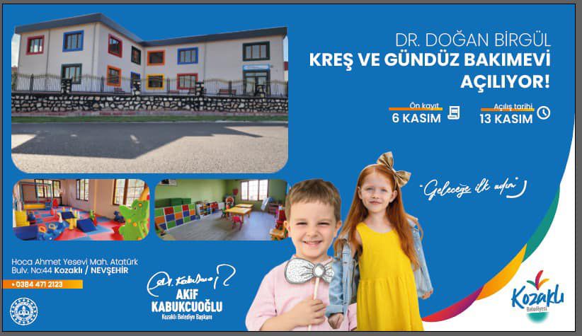 Kozaklı belediye başkanı Akif Kabukçuoğlu, “Hayalleri gerçeğe dönüştürmeye devam ediyoruz. Belediyemize ait, yapımını tamamladığımız Dr. Doğan Birgül Kreş ve Gündüz Bakımevimize (3-6 yaş) 6 Kasım Pazartesi itibariyle kayıtları almaya başladık. Şehrimize hayırlı olsun” dedi.