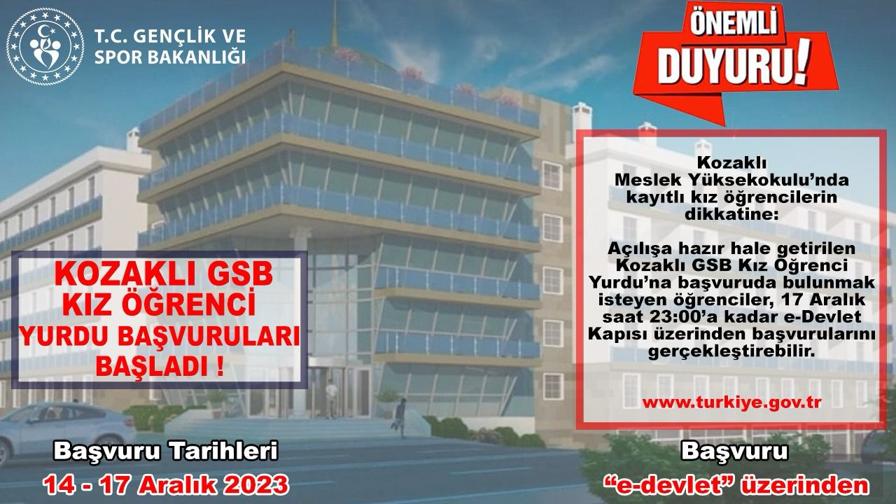 Açılışa hazır hale getirilen Kozaklı GSB Kız Öğrenci Yurdu’na başvuruda bulunmak isteyen öğrenciler, 17 Aralık saat 23:00’a kadar e-Devlet Kapısı üzerinden başvurularını gerçekleştirebilir.