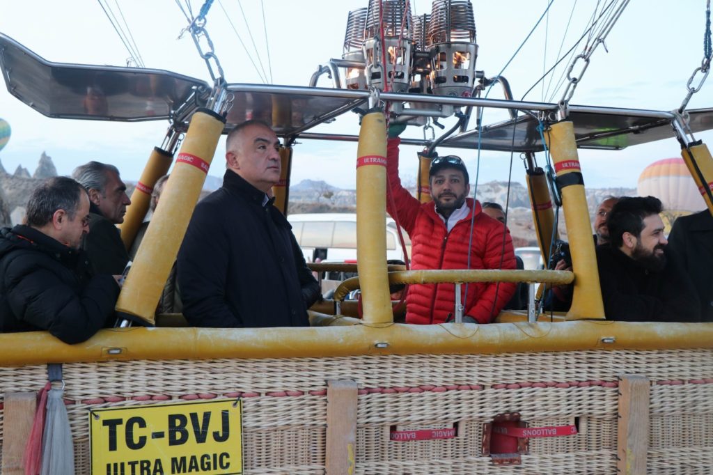 Peribacaları arasında kalkışa hazırlanan balona beraberinde Nevşehir Valisi İlhami Aktaş, AK Parti Nevşehir milletvekilleri Mustafa Açıkgöz, Yücel Menekşe, Nevşehir Belediye Başkanı Rasim Arı ve gazeteciler ile birlikte binen Bakan Ersoy, kalkış öncesinde hatıra fotoğrafı çektirdi.