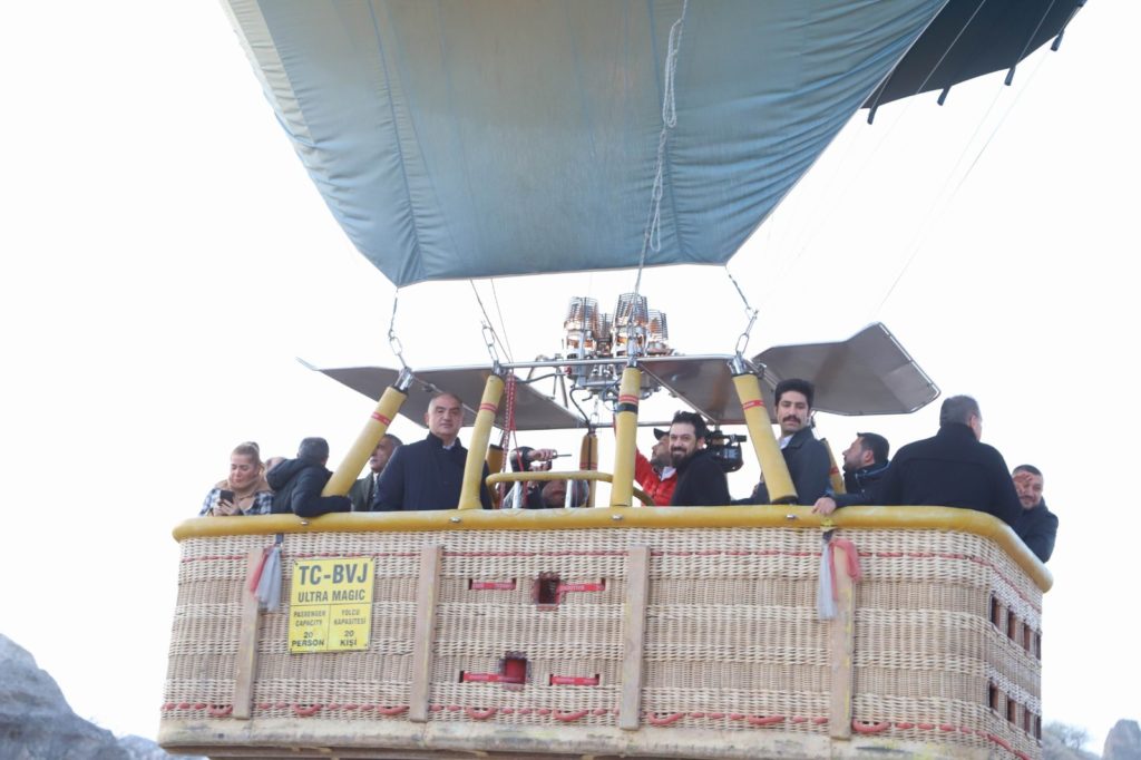 Bakan Ersoy’un bindiği balonun pilotu Halis Aydoğan kalkış öncesinde uçuş güvenliği hakkında bilgiler verdi. Daha sonra Bakan Mehmet Nuri Ersoy’un bulunduğu sıcak hava balonu peribacaları arasından gökyüzüne havalandı.