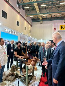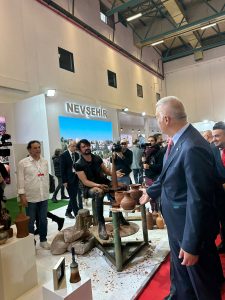 Nevşehir’de bulunan ve dünyanın en büyük kaya oyma yamaç yerleşim merkezi olan tarihi Kayaşehir’in de tanıtıldığı Nevşehir standında, Nevşehir Belediye Başkan Yardımcısı Furkan Feralan, ilçe, belde belediye başkanları ve turizmciler ile bir süre sohbet eden Bakan Ersoy, burada çanak yapımını izledi.