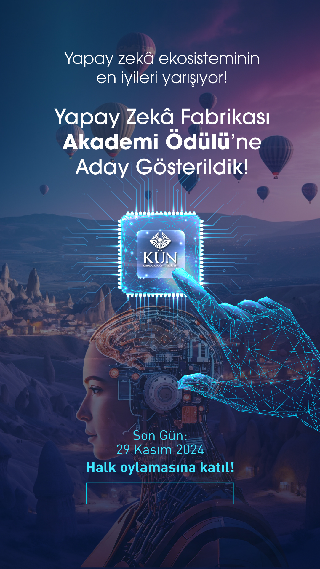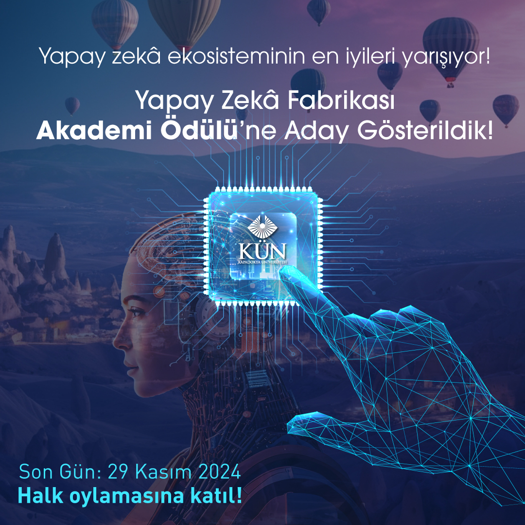 Ödül sürecinde KÜN’e destek olarak, yapay zekâ alanında yürüttüğü çalışmaların daha geniş kitlelere ulaşmasına yardımcı olabilirsiniz. YZF Akademi Ödülleri’nde Kapadokya Üniversitesine oy vererek, bu alandaki inovasyon ve liderliğini daha da güçlendirmesine katkı sağlayabilirsiniz.