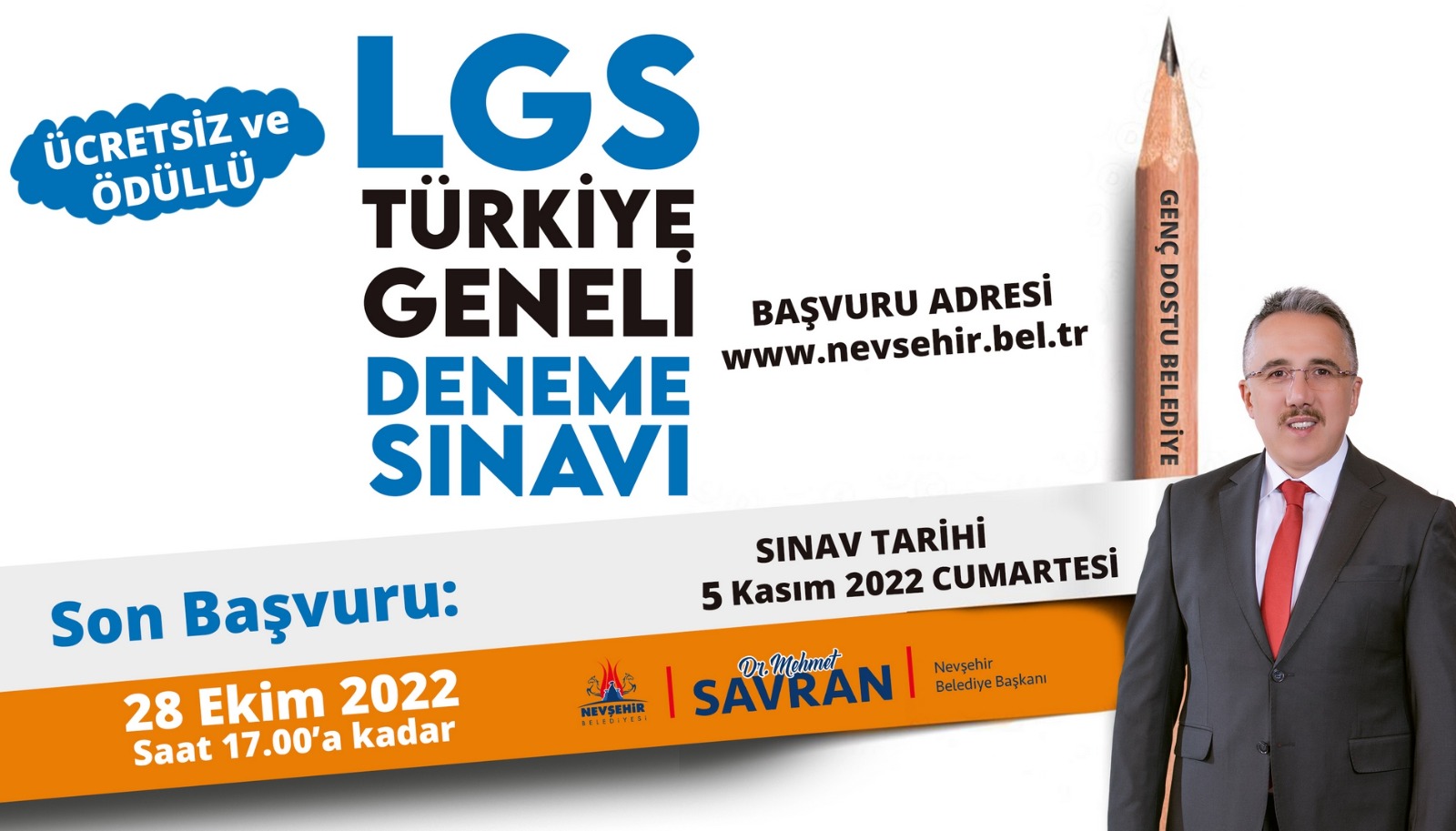 Nevşehir il merkezindeki okullarda eğitimlerini sürdüren ve ücretsiz olarak yapılacak deneme sınavına katılmak isteyen öğrenciler, başvurularını 28 Ekim 2022 Cuma günü saat 17.00’ye kadar ww.nevsehir.bel.tr adresinden yapabilecek.