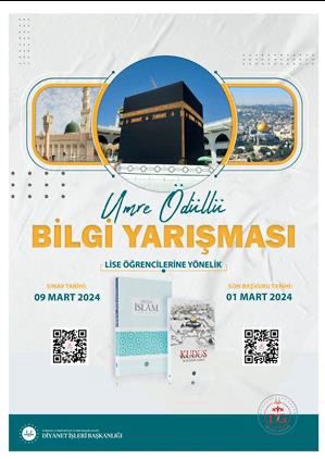 Yarışmacılar Diyanet İşleri Başkanlığı yayınlarından “Dinim İslâm Temel Bilgiler ve Mukaddes Miras Kudüs” isimli eserlerden sorumlu olacaklardır.