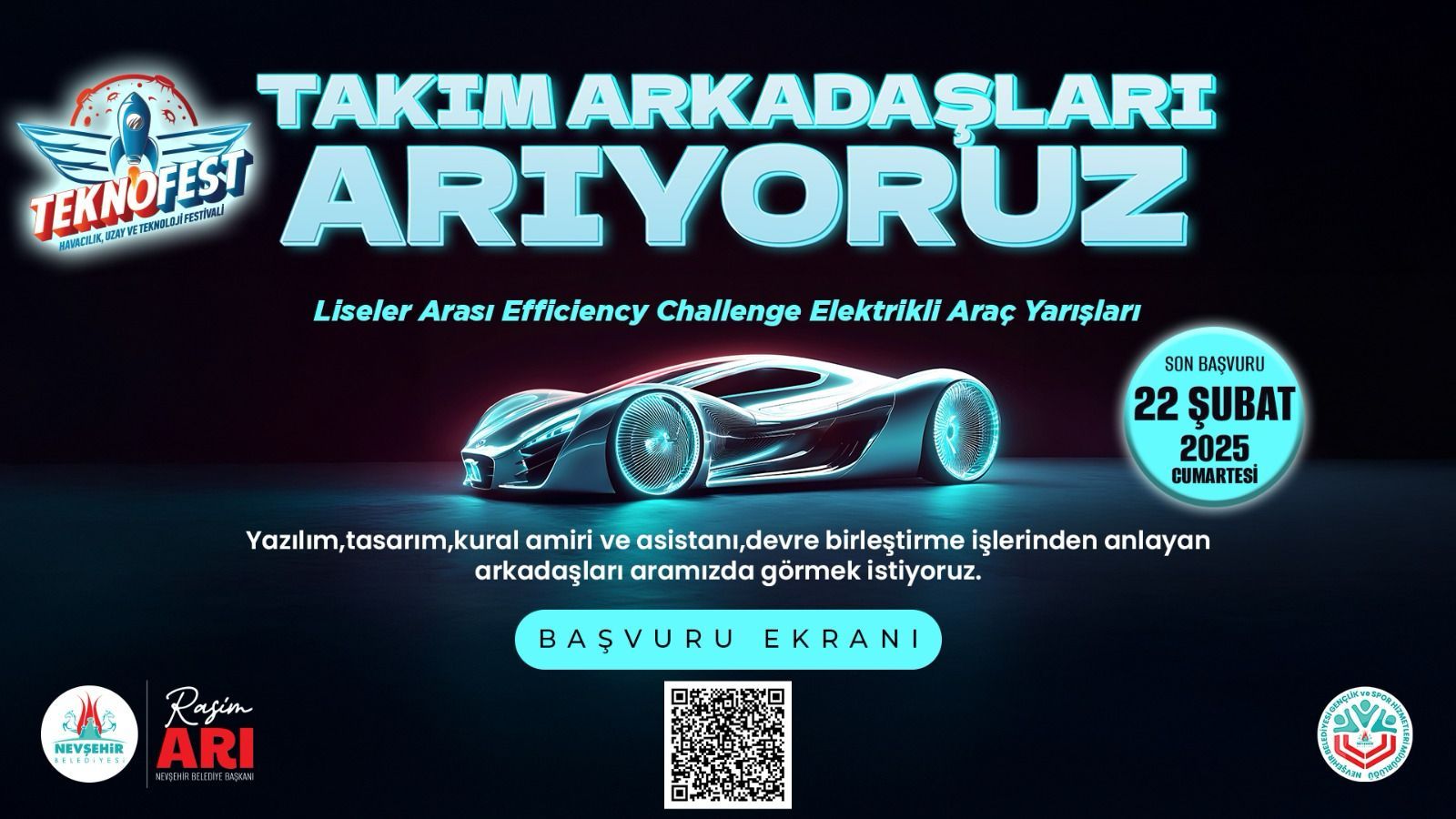 Nevşehir Belediyesi Teknoloji Fest 2025 Liseler arası Efficiency Challenge Elektrikli Araç Yarışları dalında takım kuruyor.