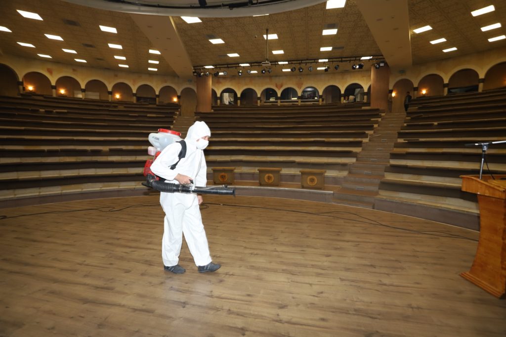 Toplantının yapılacağı Kapadokya Kültür ve Sanat Merkezi’nde, yeni tip koronavirüs (Kovid-19) tedbirleri kapsamında dezenfekte çalışması gerçekleştirildi.