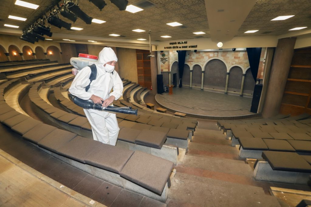 Temizlik İşleri Müdürlüğüne bağlı ekiplerce gerçekleştirilen çalışma ile birlikte toplantının yapılacağı salon, fuaye salonu, bekleme bölümleri titizlikle temizlenerek dezenfekte edildi.