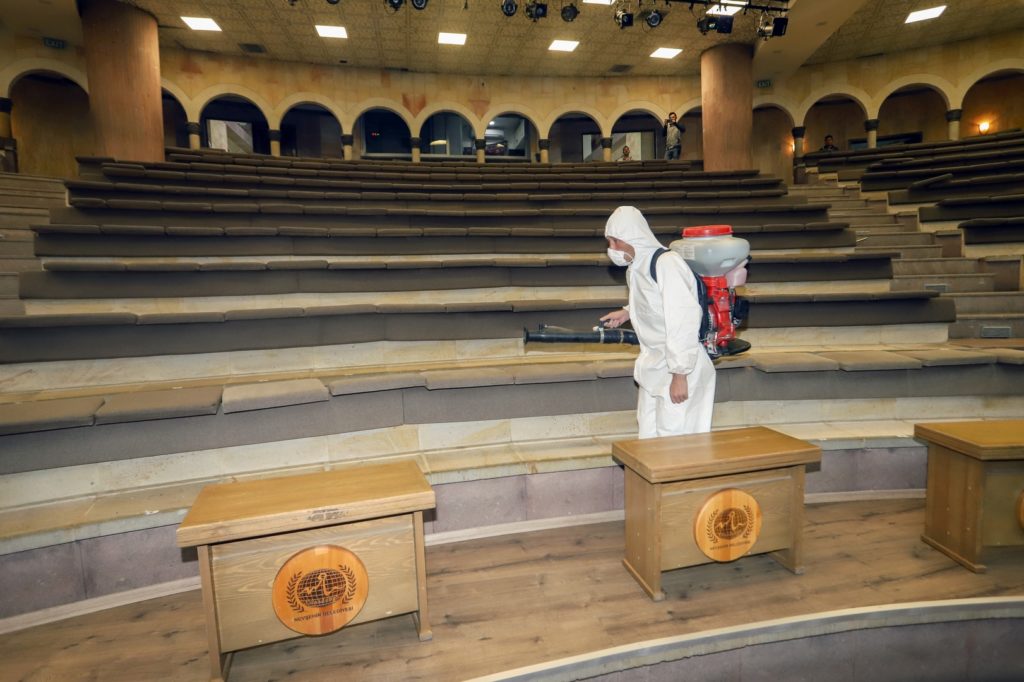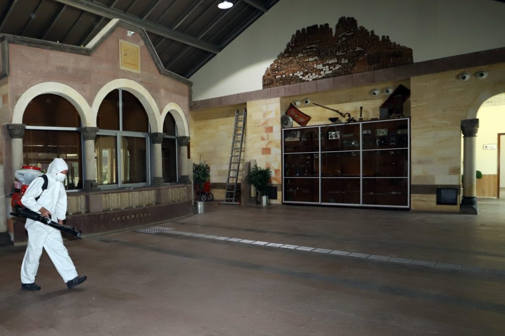Koronavirüs tedbirleri nedeniyle sosyal mesafenin korunabilmesi amacıyla Kapadokya Kültür ve Sanat Merkezi’nde gerçekleştirilmesi kararlaştırılan toplantı öncesinde, merkezde dezenfekte çalışması gerçekleştirildi.