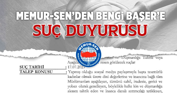 Memur-Sen Nevşehir İl Başkanlığından konuya ilişkin yapılan açıklamada; “A Milli Kadın Voleybol Takımımızın FIVB Milletler Ligi 2023 Şampiyonluğuyla ülke olarak hep birlikte gurur duyarak sevinç yaşadığımız, tarihi bir başarı elde edilen bir günde; “Kadın isterse, yapar ve bu ülkenin Cumhuriyet kadını bu ülkenin başını her daim dik tutar! Yobaza inat!..” ifadelerine yer vererek tesettürlü kadınların dini kıyafetler giyinmiş bir erkeğin önünde set oluşturduğu; voleybolcu bir başka kadının ise bu topluluğu hedef alarak sert bir smaç attığı karikatürize bir görsel twitter sosyal medya ağında paylaşan Prof. Dr. Bengi Başer hakkında: nefret suçuna, halkı kin ve düşmanlığa tahrike, inanca dayalı ayrımcılığa neden olan insan haklarına, insan onuruna açık saldırı niteliğindeki, ayrımcılık yasağına dair kesin ihlal kapsamında olan söylemlerine yönelik olarak İstanbul Anadolu Cumhuriyet Başsavcılığı’na suç duyurusunda bulunduk ve gerekli işlemleri yerine getirmesi için TİHEK’e başvuruda bulunduk.
