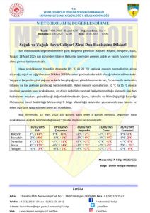 Yapılan açıklamada, ”Meteorolojik Uyarı Yapılan son değerlendirmelere göre; İlimiz genelinin 18 Mart 2025 Salı gününden itibaren soğuk ve yağışlı havanın etkisi altına girmesi beklenmektedir. Yağışların Çarşamba günü yağmur ve karla karışık yağmur, yüksek kesimlerde kar, Perşembe ilk saatlerden itibaren ise kar şeklinde görüleceği beklenmektedir. Bu sebeple; hava sıcaklıklarında meydana gelen ani düşüş ile birlikte tarımsal faaliyetlerin olduğu alanlarda zirai don tehlikesine karşı tedbirli olunması önem arz etmektedir.” denildi.
